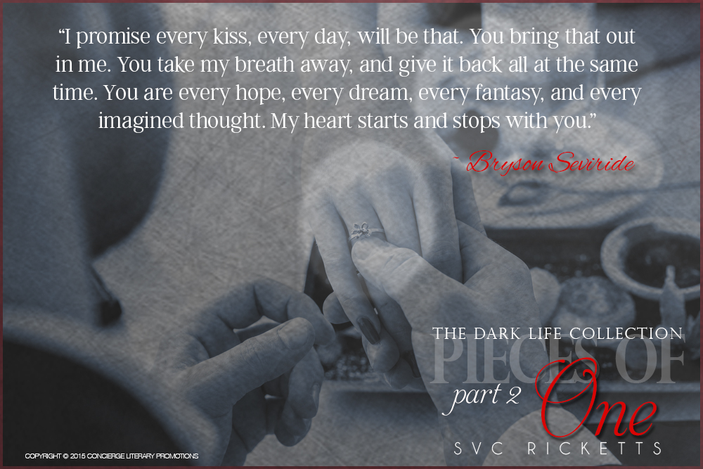 SVC Ricketts is an indie Contemporary Romance author and professional smart alec (self-professed). Her work has been recognized by the Pacific Northwest Writers Association and was selected as a finalist for the 2013 PNWA Literary Competition in the Romance category. She self-published her first book, a LGTB Romance novella called My Last Season With You in October of 2014. Then in June 2015, indie published Pieces of One, Part 1, the first book in The Dark Life Collection.